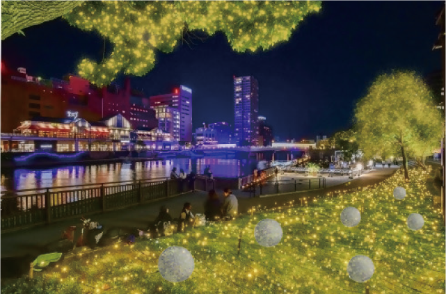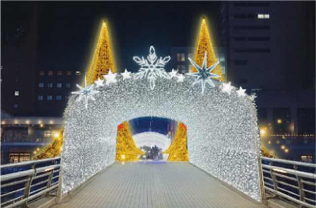 周辺やなど小倉都心部の約20カ所で小倉イルミネーションを開催中です。今年は紫川周辺に2つのフォトスポット、鷗外橋にはツインタワーと光のトンネルが登場。その他、紫川ナイトスペクタクルやクリスマスマーケットなど、多様な催しも同時期に開催されています。