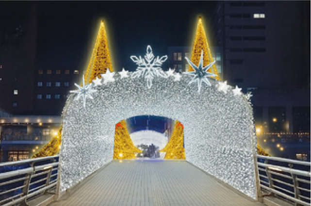 イルミネーショントンネルが今年も登場!クリスマスマーケットのツインタワーとともに、橋の中央から両岸へと続く白一色のイルミネーションで、紫川に白銀の世界を描きます。