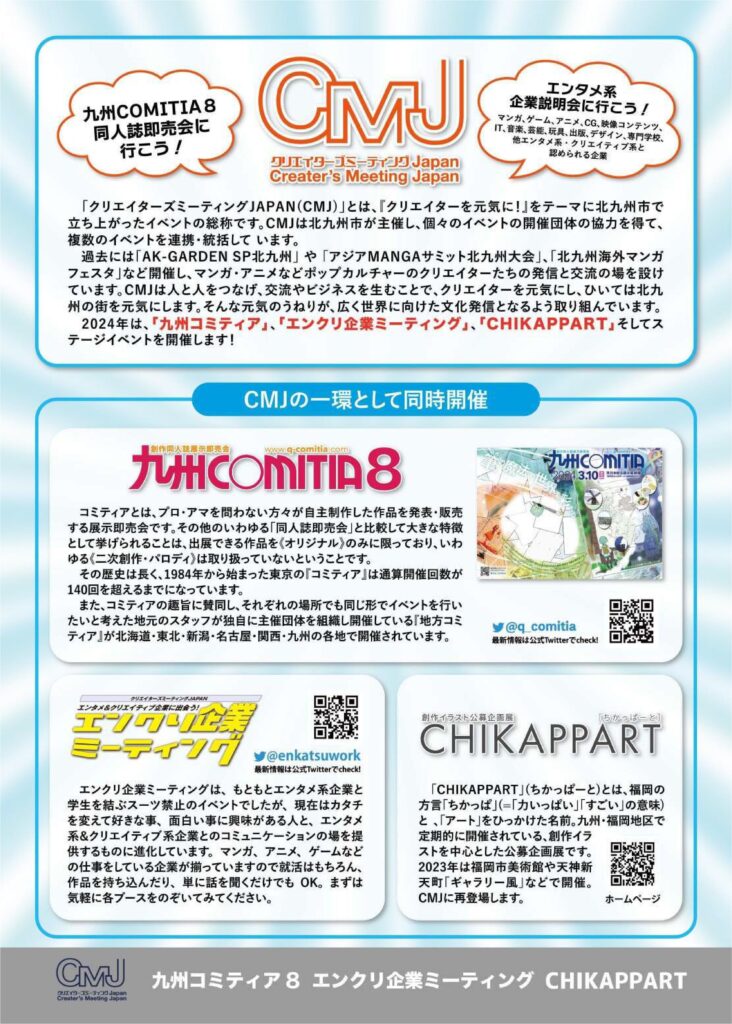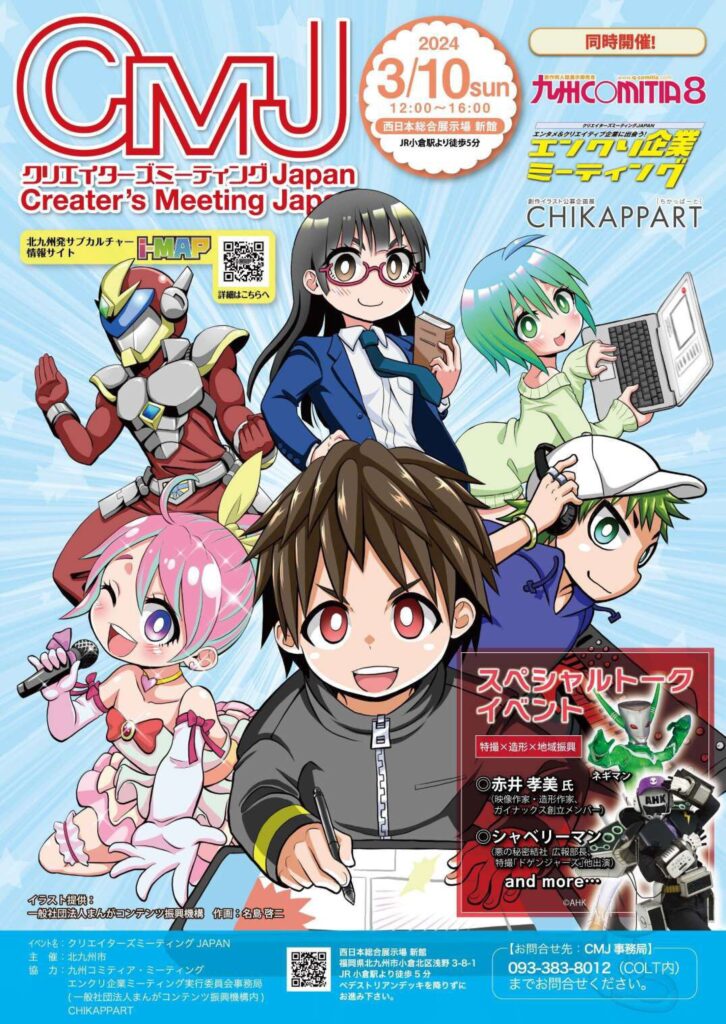 クリエイターの作品発表の機会提供、漫画出版・アニメ制作・ゲーム制作会社などエンタメ関連企業とのマッチングなどを行う、クリエイターの育成・支援を目的としたイベント「クリエイターズミーティングJAPAN(CMJ)」。クリエイターが展示・販売する作品の購入や、クリエイターとの交流ができる他、特別ゲストによるステージイベントも観覧できます。ぜひ、お越しください!