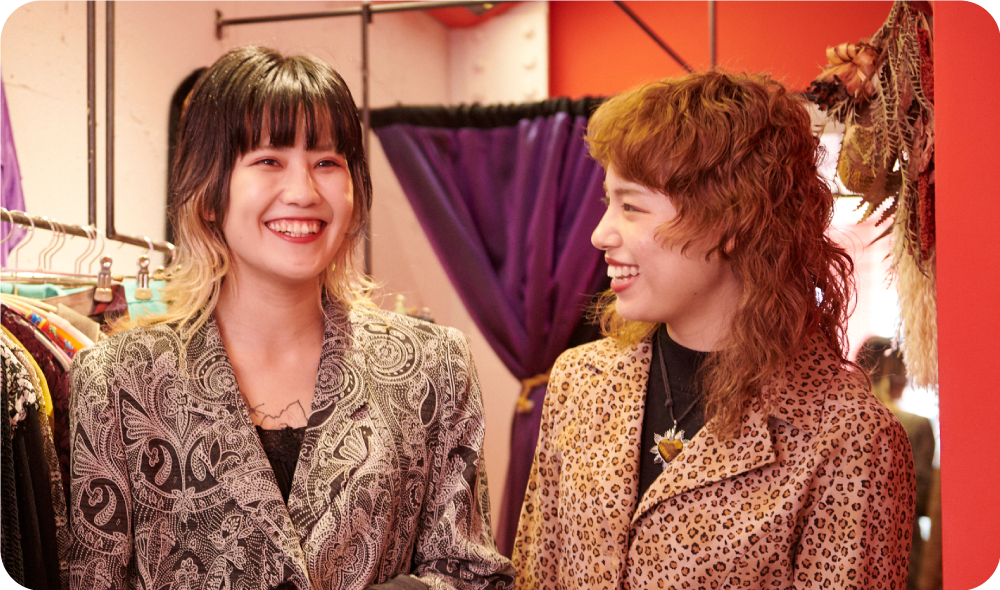 カレンさんとスイミさんがオープンさせたアパレルショップ「魅女」には、古着、着物リメイク、オリジナル商品などが華やかにディスプレイされています。それぞれの場所で生まれ育ったふたり。北九州市で出会ったことをきっかけに、友人になり、ビジネスパートナーへ。若くして好きなことを仕事にし、県内外からファンが訪れるショップをつくるためにやったことを語っていただきました。