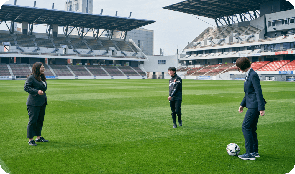 実は、私はサッカー経験がないんです。でも、スタジアムに足を運んだときのライブ感、非日常感に虜になったんです。そんなエンターテイメントが、ドキドキわくわくが、身近で起こっていることをこのまちのみなさんにもっと伝えたいです。