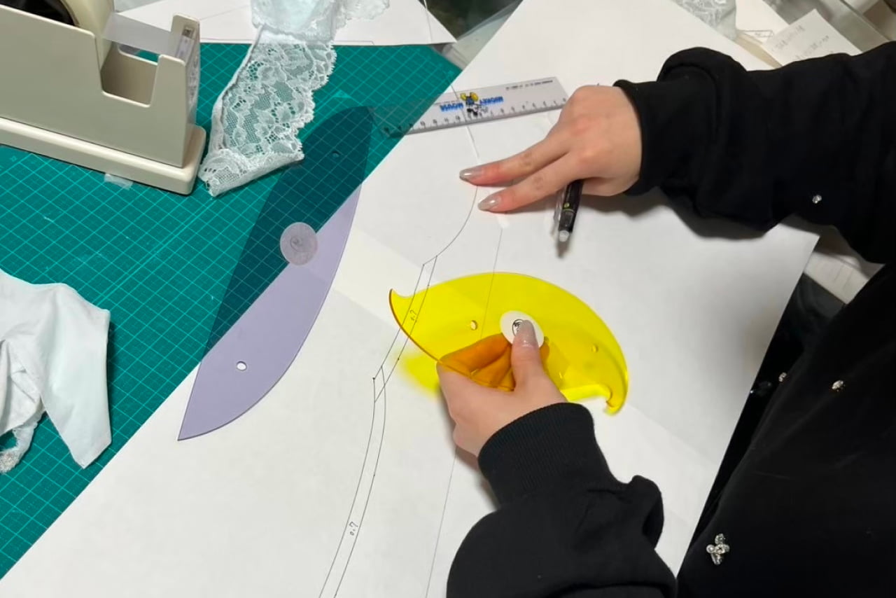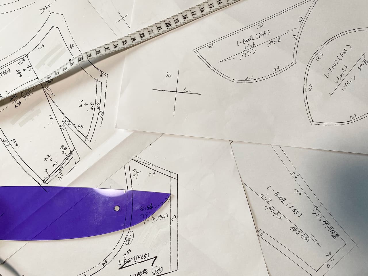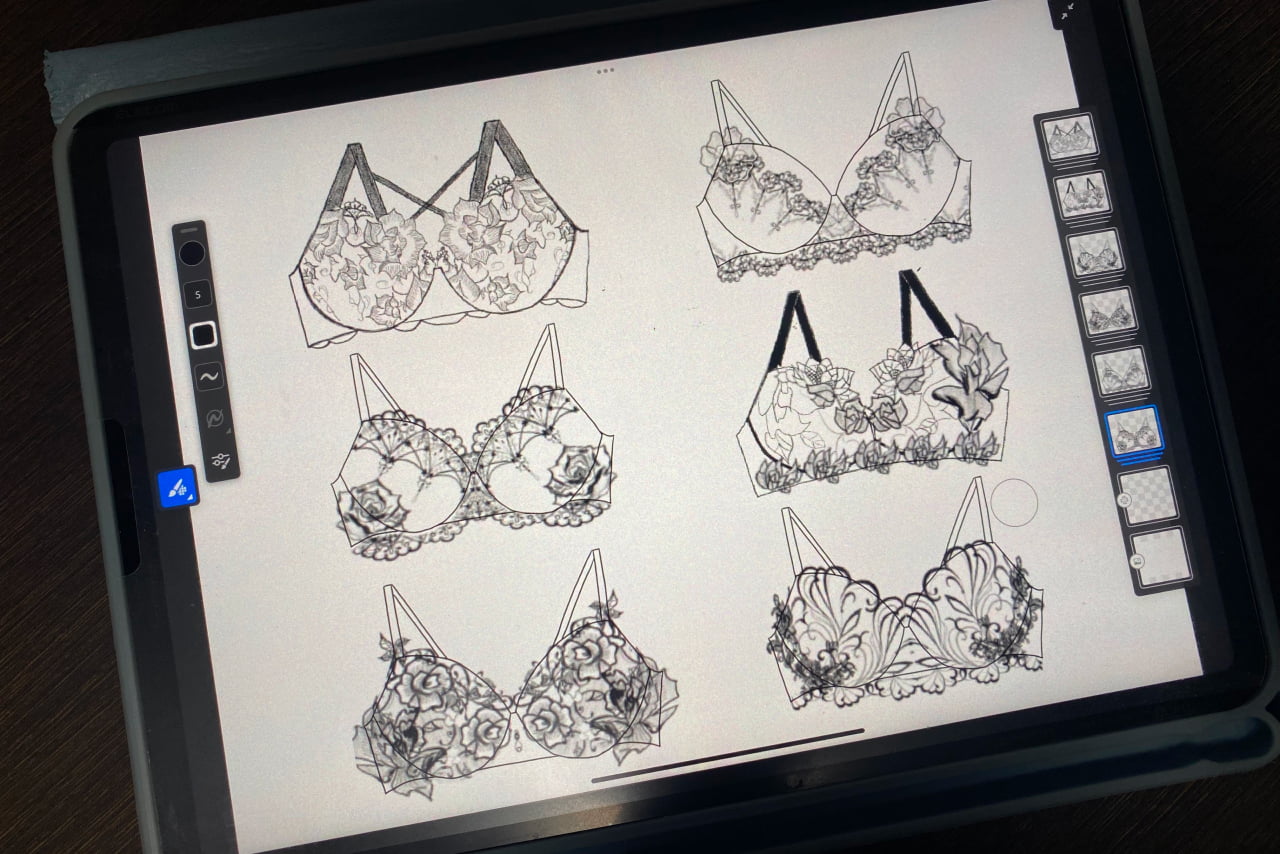 レースは、高度な職人技術を要するリバーレースを用い、色味や柄について打ち合わせを進めました。そしてラインナップは、全5アイテムを予定しており、シルエットや着用時の美しさを意識しながら、まずは平面上で形に落とし込んでいきます。